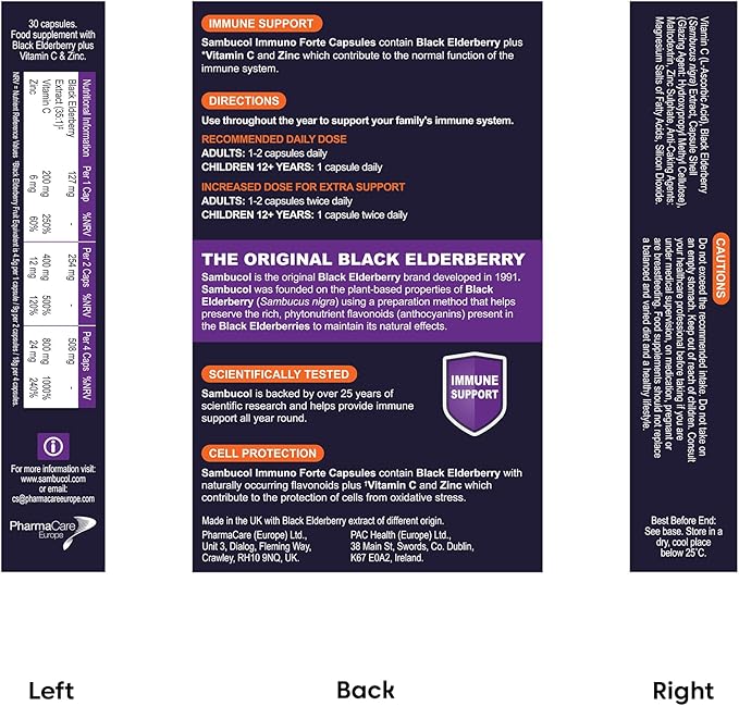 كبسولات سامبوكول إيمونو فورت تحتوي على خلاصة طبيعية من توت العليق الأسود، إلى جانب فيتامين C والزنك. صُممت لتكون مريحة وسهلة الاستخدام، مما يجعلها مثالية أثناء السفر أو مع أنماط الحياة المزدحمة.