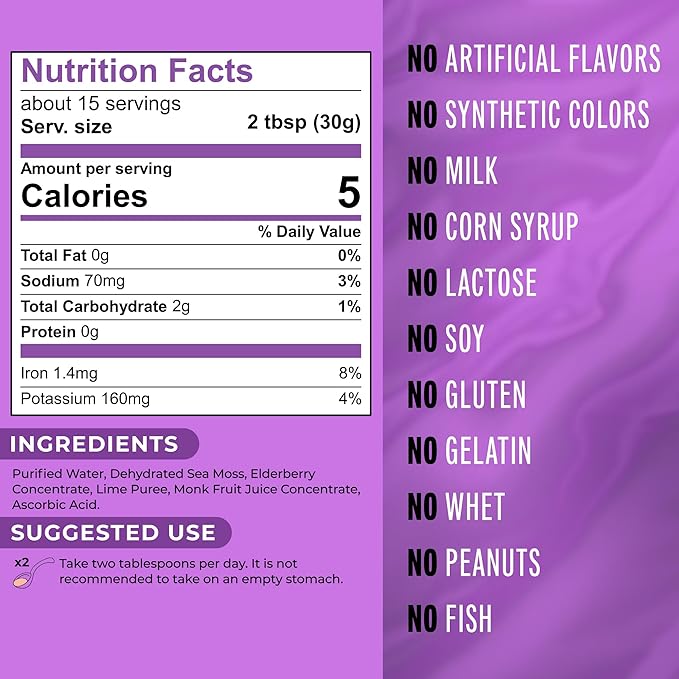 • Premium wildcrafted sea moss gel infused with real elderberry puree for natural flavor.