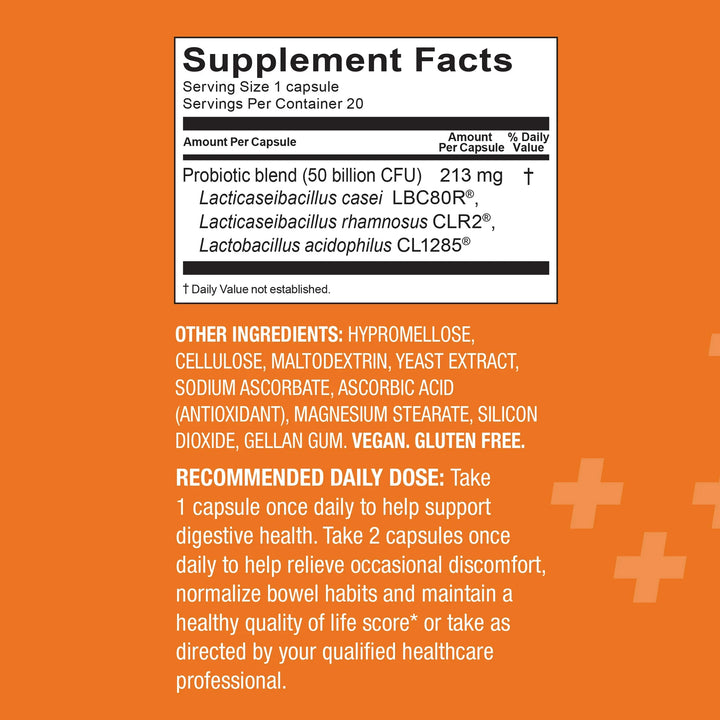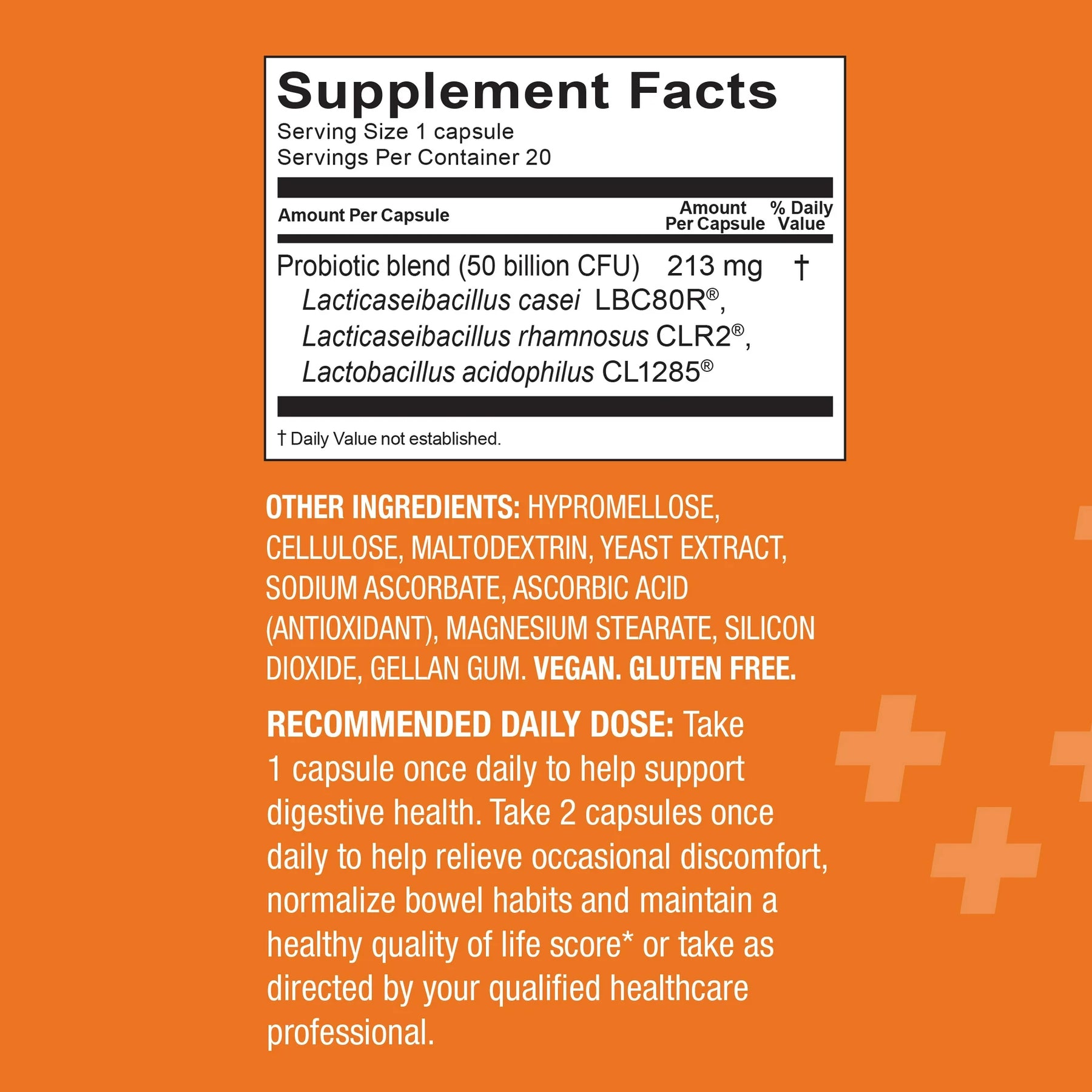 Formulated with proprietary strains L. acidophilus CL1285, L. casei LBC80R, and L. rhamnosus CLR2, this advanced probiotic supports digestive balance, promotes a healthy gut microbiome, and provides targeted relief for optimal digestive health.