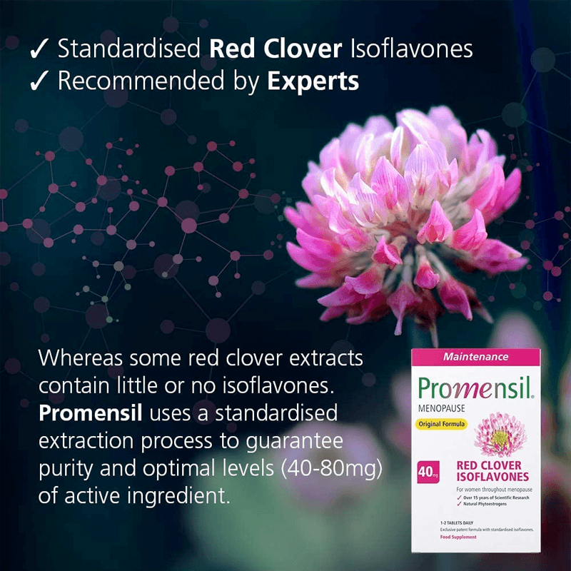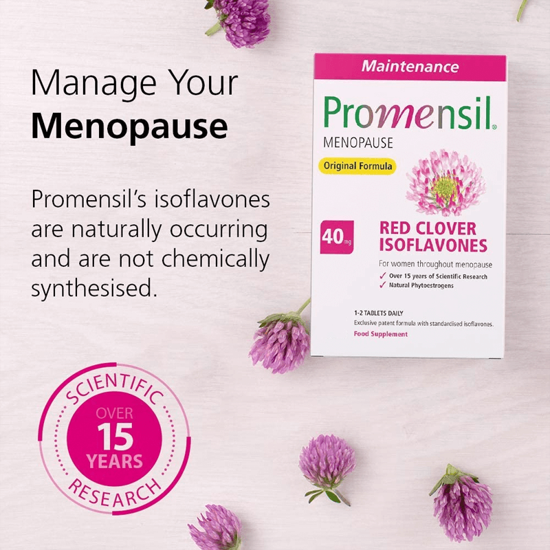 Promensil Menopause Original Formula provides 40mg of standardized red clover isoflavones per tablet. Crafted to high quality standards, it offers a convenient daily supplement option for menopause support.